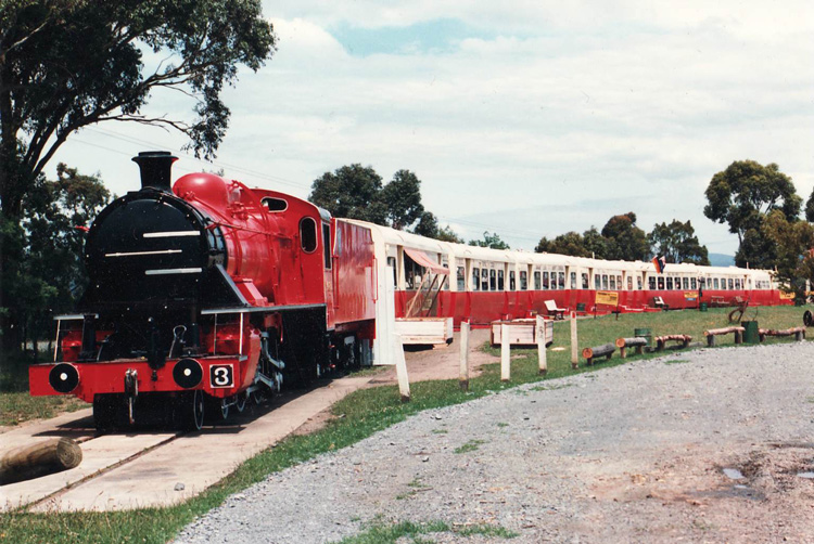 MA3 is now plinthed outside the Margate market, south of Hobart, which replicates a railway station and features cafes & other market stalls, despite the fact that the railway never reached Margate! The carriages comprise a former 'Tasman Limited' articulated carriage (ACS1), 'SS' suburban cars and a 'DP' railmotor. d
